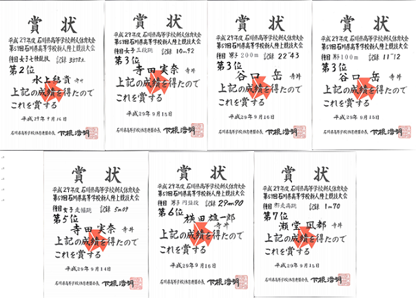 5月7日、8日に開催された、第77回石川県陸上競技選手権大会に9名の生徒が参加しました。その中で、女子三段跳びで第2位、女子走り幅跳びで第3位、男子走り高跳びで第5位と好成績を残すことができました。いよいよ県高校総体も近づいてきましたが、学校のほうは今週から考査期間に入るので、しばし小休止です。