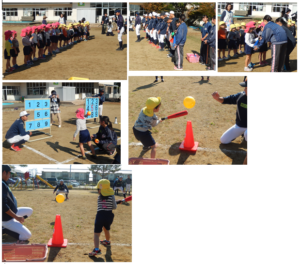 豊美保育園のユリ組、バラ組の皆さんと野球教室を開催しました。とても良い天気に恵まれ、園児の皆さんも、寺井高校の野球部員も、みんな良い笑顔で楽しんでいました。