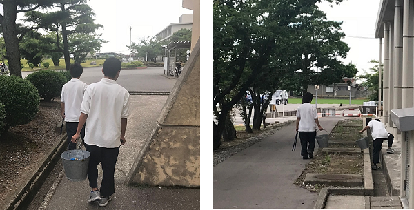 学校敷地内の美化のために、美化委員会は毎朝、清掃活動を行っています。学校の顔とも言える校門や生徒玄関周辺を中心に、通常より早く登校し活動しています。生徒のみなさんも落ちているゴミを拾ったり、ゴミを分別して捨てたりするなど、学校をキレイにする活動に協力をお願いします。