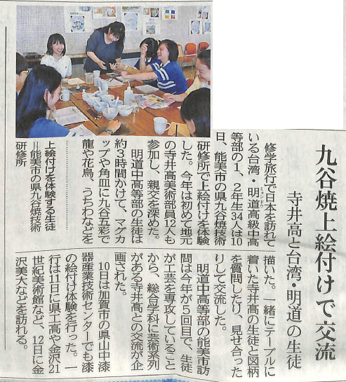 台湾から修学旅行で石川県を訪れている、台湾明道高級中高学部の生徒達と本校の美術部員が、九谷焼技術研修所で九谷焼の上絵付けで交流しました。大変和やかな時間を共に過ごすことができました。良い思い出を持ち帰っていただきたいと思います。
