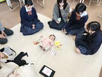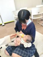 始めは小さな赤ちゃん(4か月)を前に、様子を見ていただけの生徒も、教えていただきながら、ミルクを作り飲ませたり、抱っこしたりする体験ができました。お母さんからは、普段の育児の様子や赤ちゃんの発達について教えていただいたり、おむつ替えなどお世話の様子も見せていただき、とても良い機会となりました。