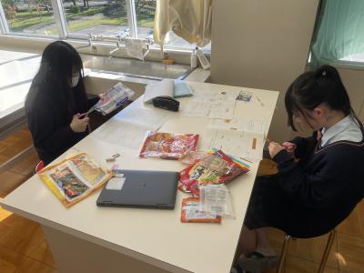 【生活・福祉系列】3年選択科目「フードデザイン」では、食品表示について学びました。食品のパッケージをたくさん集め、どこにどのような情報が書かれているかまとめました。いつも食べているお菓子などにどんなものが入っているのか、添加物やアレルギー表示についても学ぶことができました。