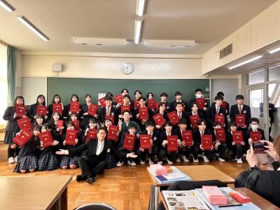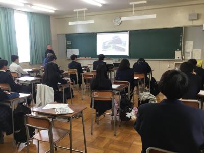 2月14日(水)にキャリア教育の一環として、現役の寺井高校生に本校卒業生の村上忠志様(2回卒)、小坂勇治様(19回卒)、脇坂洋子様(16回卒)がお話くださいました。