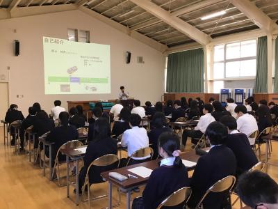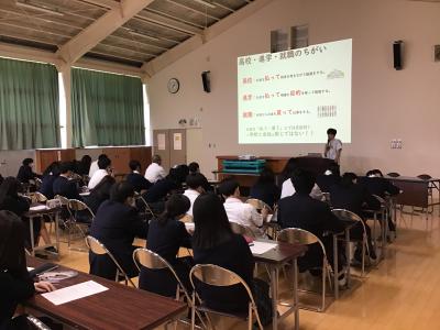 「学校と会社の違い」や「インターンシップで大切な3つのこと」など、生徒に身近な話題で講義していただき、生徒たちはメモを取りながら熱心に聞いていました。