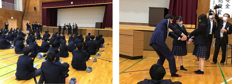 交通安全教室では、自転車乗車時はヘルメットが着用義務になったことや、高校生が加害者になってしまう事故も発生しており、ルールを守る大切さを話していただきました。