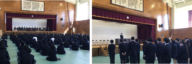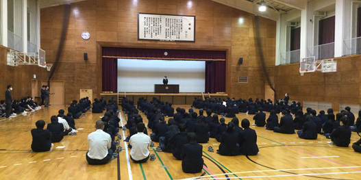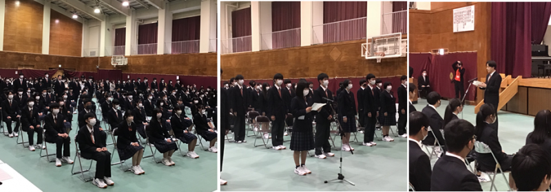 今回の終業式は、リモートではなく、体育館に集まりました。在校生は、高校生活が始まって以来、全学年(1,2年生)での集会になりました。