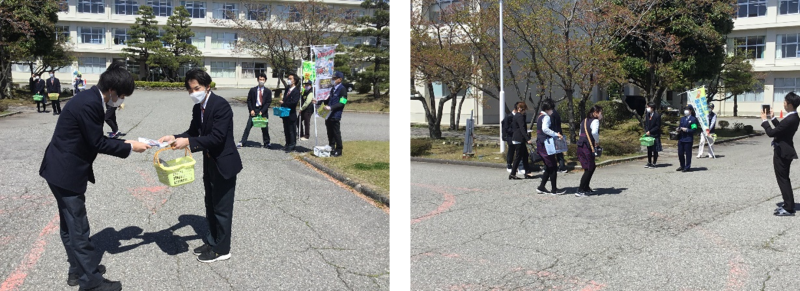 4月10日(月)入学式にあわせて、本校イーグル隊の生徒と能美警察署、能美少年補導員連絡会、能美市寺井地区防犯委員会、能美防犯協会が協力参加して、非行防止キャンペーンを実施しました。新入生にスマホの危険性を訴えるチラシや自転車盗難防止のワイヤー錠を配布し「非行防止」「自転車盗難防止」を呼びかけました。