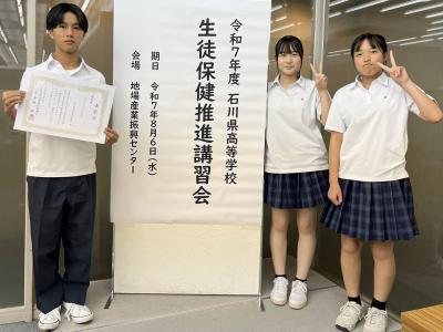 令和7年8月6日、石川県高等学校生徒保健推進講習会が開催され、保健委員の生徒たちが、1学期に研究を重ねた「スマホアルゴリズムの罠」というテーマで発表を行いました。