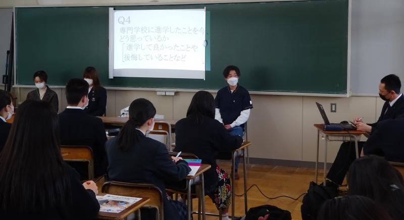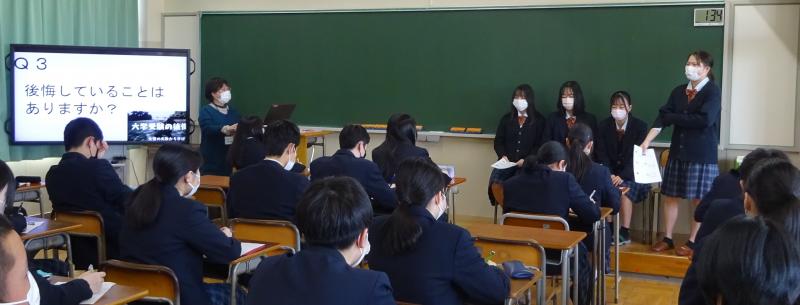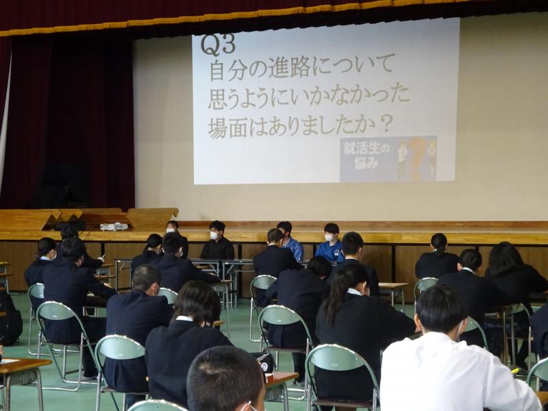 事前アンケートをもとにした質問、どんなことを重視して進路決定を行ったか、また、辛いとき、思うようにいかないときどうしていたか、そして、高校生のうちにやっておくことは何かなどに対して語っていただいた言葉は、とても実感のこもったものでした。新2年次生、新3年次生への進級を目前に控えた生徒達にとって、進学・就職に向けての気持ちを新たにする大変良い機会となりました。