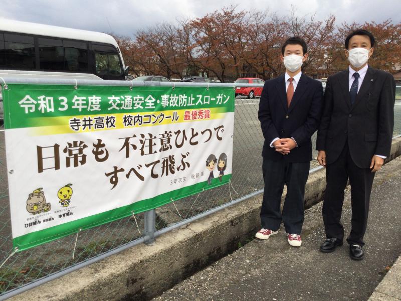 校内コンクールで最優秀賞に選ばれた3年1組後藤蓮君のスローガンが、学校横のフェンスに横断幕として大きく設置されました。北國新聞社の取材も受け、「車を運転する人だけでなく、スマホを見ながら運転する人にも注意してほしい」と語り、地域の交通安全を呼びかけました。