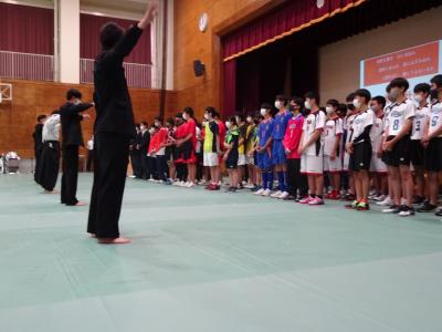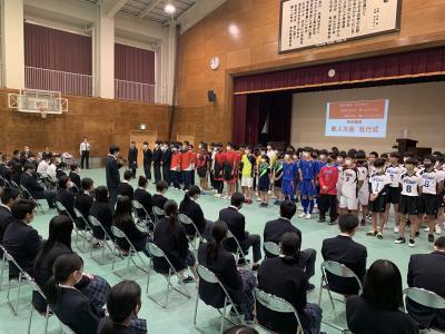 11月6日(土)新人大会壮行式を行いました。感染予防のため2年生は体育館で、1・3年生は教室でオンライン配信を見る形になりました。学校長・生徒会長からの激励、選手決意表明、応援団の応援披露のあと、選手代表としてウエイトリフティング部の坂田くんがお礼の言葉を述べました。
