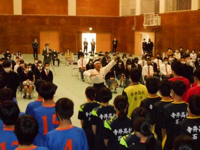 2021年11月6日 17時00分11月6日(土)新人大会壮行式を行いました。感染予防のため2年生は体育館で、1・3年生は教室でオンライン配信を見る形になりました。学校長・生徒会長からの激励、選手決意表明、応援団の応援披露のあと、選手代表としてウエイトリフティング部の坂田くんがお礼の言葉を述べました。