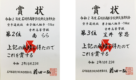 空手道部が、女子個人組手2位、男子個人組手3位に輝きました。