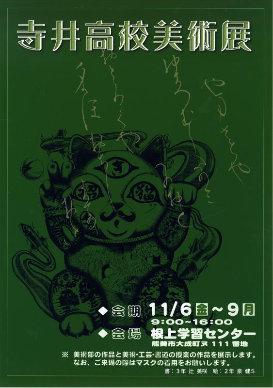 毎年開催しております「寺井高校美術展」を下記の通り開催いたします。この作品展では、本校の美術、工芸、書道の各授業および美術部の活動で制作した作品を展示いたします。