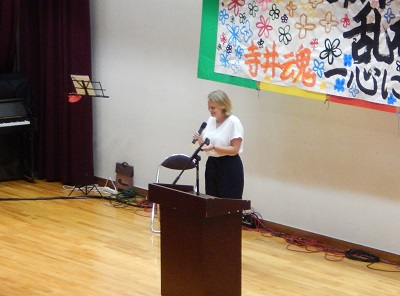 8月30日(金) 新しいALT エリザベス・ニコルソン・グラハム先生(ニキ先生)の新任式と、2学期始業式が行われました。