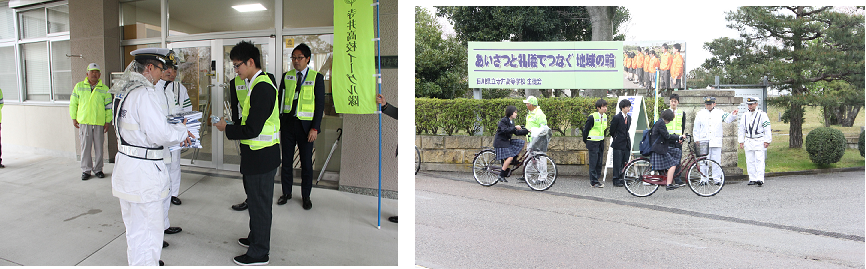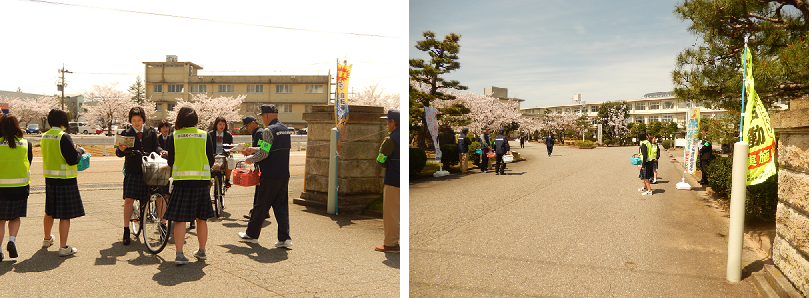 4月11日(火)~12日(水) 交通安全街頭指導が行われました。 入学式の前には、新入生に向けて、交通安全についてのチラシを配りました。