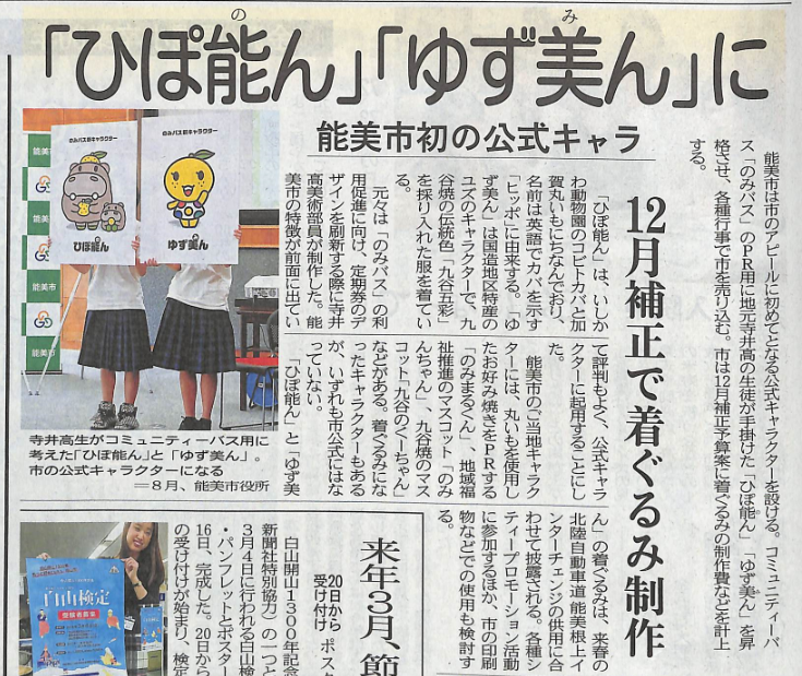 ひぽ能ん ゆず美ん 公式キャラに! 2017年12月2日 13時10分 寺井高校美術部員が考案した、「のみバス」のキャラクター「ひぽ能ん」と「ゆず美ん」が今度は、能美市の公式キャラクターになりました。能美市内のいろんな場所で、出会えることと思います。よろしくお願いします。平成29年11月17日(金)北國新聞 朝刊 31面(石川南欄) いいね