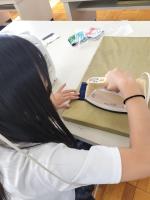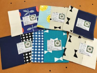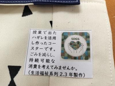 そこで、今年度2,3年生の生活福祉系列の生徒たちが、それらのハギレを活用し、これまで学んだ技術を活かし、コースター作りに取り組みました。作成した約50個のコースターは文化祭で行った「能美検定ウォークラリー」の参加賞としてプレゼントすることができました。