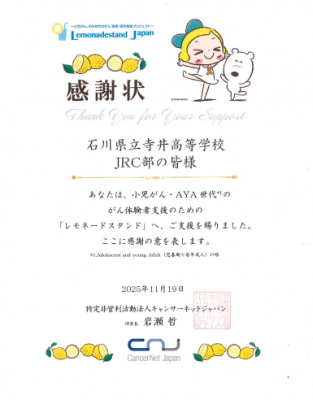 2025年12月10日 10時30分先日の文化祭で実施した、JRC部による小児がん支援チャリティ「レモネードスタンド」に、温かいご協力をいただき、誠にありがとうございました。