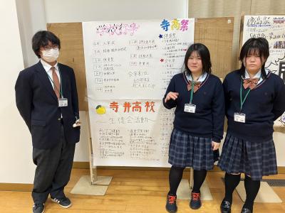 本校からは生徒会長の油さん、副会長の久田さん(ともに21H:寺井中出身)、同じく副会長の信濃さん(23H、辰口中出身)が参加しました。