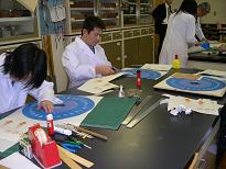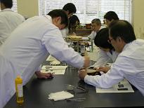 まず、新学習指導要領で新たに導入された観察・実験として「細胞と生殖」「地球と宇宙」について実習を行い、その後、参加の先生方による授業実践報告・協議が行われました。中学校理科は、今年度より先行実施されており、すぐに役立つ内容の研修となりました。