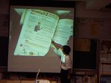 先生方は一生懸命教科書をめくり、既習についてや言語活動についてどのように記載されているかどのように変わっているのかを比較していました。最後に、実物提示機で教科書を提示しながら、気づいたことを発表してもらいました。