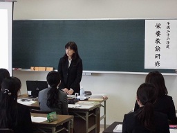 この研修は、講師に県教育委員会スポーツ健康課指導主事の田中靖枝氏を迎えて年間5回行われます。1回目のこの日は、栄養教諭の職務内容と、食に関する指導の全体計画・年間指導計画について理解を深め、情報交換なども行いながら、意識と意欲を新たにする充実した時間を持つことができました。受講生からは、「栄養教諭となりどうすればよいのか不安でしたが、『焦らず丁寧に目指すものをもって』との言葉をいただき、子ども達みんなが楽しいと思える給食の時間を目指して頑張っていこうと思いました。」という声が聞かれました。