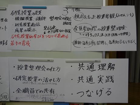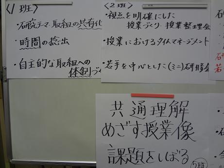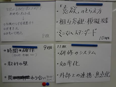 前半は、各校の取組実践について交流しました。第1日目を受けてどのように活性化を図ったのか、どのような手法が効果があったのかについて、小中校種ごとでグループ協議を行いました。後半は、中学校の授業DVDを視聴し、授業分析を行いました。自分たちの授業分析の目を肥やそう、校種や教科の壁を超える目を持とう、ということを目標に取り組みました。討議ではあちこちから意見が飛び交い、小学校と中学校の授業の共通点や、ねらいの違いなどにも話しが及びました。活発な討議となり、学校でも取り入れたいという意見が出ていました。