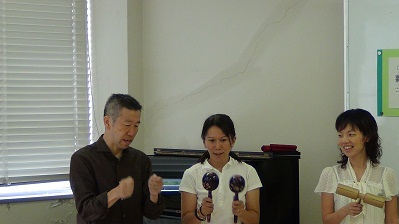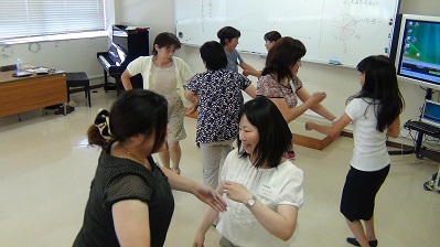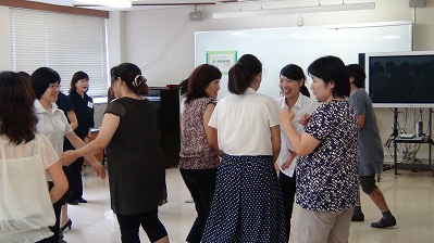 研修は、模擬授業形式の演習で進められ、参加者自身が体を動かしながら音楽を感じ取る活動を行い、実感を伴いながら楽しい音楽の指導法を学ぶことができた。拍が流れる感覚やフレーズの感覚を養うことができる音楽ゲームの紹介や音楽ゲームから発展させた音楽づくりの指導、リトミックの要素を取り入れた鑑賞学習の指導など、小学生の発達の段階に合った多くの実践を知ることができ、多くの示唆をいただいた。2学期からぜひ実践したいという参加者の声も多く、子ども自身が音楽の本当の楽しさを見つけることができる授業実践が広まることを期待したい。