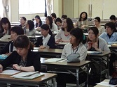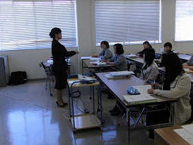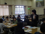 前半は、「なぜ音読するのか」「朗読とは」について、学習指導要領にも関連づけながら説明が行われ、国語科のつけたい力について理解を深めることができた。後半は、「音読表現力をつけるにはどのような指導のポイントが必要か」について、演習を交えて説明が行われた。教材文と真剣に向き合いながら何度も練習を行うことで、新たな読みの解釈が生み出されることに気付き、自信に満ちた表情で発表する初任者の姿が見られた。