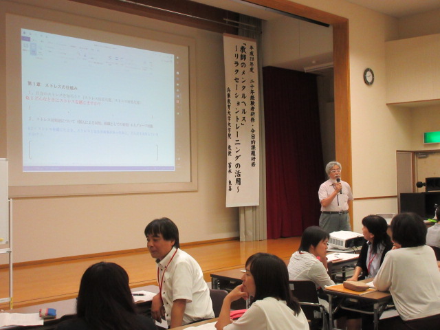 8月2日(火)、県教育センターにて兵庫教育大学大学院の冨永 良喜氏をお迎えし「教師のメンタルヘルス~リラクセーショントレーニングの活用~」について研修が行われました。84名の受講がありました。