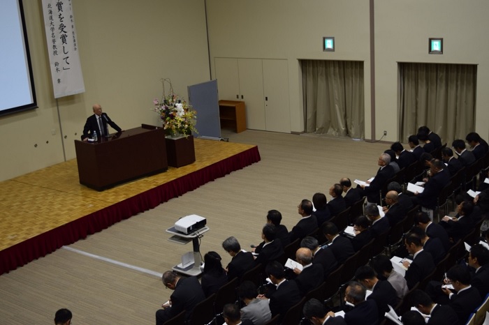平成29年10月4日(水)、県地場産業振興センターにて石川版ノーベルレクチャーを開催しました。ノーベル賞受賞者をお招きする講演会は今年で4年目となります。今年度は、2010年ノーベル化学賞受賞者の鈴木章先生(北海道大学ユニバーシティプロフェッサー、名誉教授)をお招きして講演会を実施しました。「Nobel化学賞を受賞して」と題して、2冊の本との出会いが化学者へと導いたお話しや、ブラウン先生へ手紙を書いたことをきっかけにパデュー大学へ2年間留学し、ホウ素の研究に取り組んだことなどについてお話していただきました。医薬をはじめとした様々な化合物の合成に鈴木カップリング反応が用いられている紹介の中では、先生ご自身に処方された薬の製造に鈴木カップリング反応が用いられていることを、知り合いの薬剤師の方から教えていただいたことがあったというエピソードもお話していただけました。また、質疑応答の時間を十分に確保していただき、受講者や高校生からの様々な質問に、丁寧にお答えいただきました。