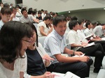 教科等専門研修「ノーベル賞につなぐ高校理科」の第3回の講座が平成29年10月4日(水)、県地場産業振興センターにて開催されました。石川版ノーベルレクチャーでお招きした鈴木章北海道大学ユニバーシティプロフェッサー、名誉教授(2010年ノーベル化学賞受賞)と受講者10名との懇談会を実施しました。受講生からの様々な質問に対して鈴木先生にお答えいただく形で懇談会が進みました。先生のご研究についての質問や幼少期の思い出などについて、先生は大変丁寧にお話ししてくださいました。先生の研究の内容を深く知ることができただけではなく、鈴木先生の優しい人柄にふれることができ、受講生にとっては貴重な体験となったようです。鈴木先生からいただいた言葉を、今後学校の生徒に還元していこうという感想が多くありました。また、懇談会の後は、続いて行われた石川版ノーベルレクチャーに参加しました。