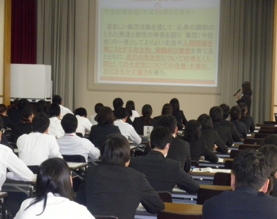 午後の特別活動では、まず、学習指導要領の確認をしました。実際に自分が担当している学級活動や委員会活動、クラブ活動をイメージしながら、特別活動の目標について理解を深めました。