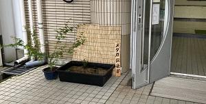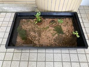 正面玄関前のメダカ水槽を夏っぽくしてみました。