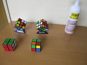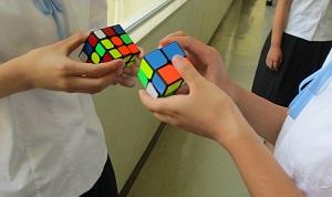 昼休みになると、生徒たちがチャレンジしています。なかなかうまくいかないので、何度も試行錯誤を繰り返しています。試行錯誤を繰り返す中で、何らかの法則性に気づき、次のステップを目指していきます。そしてまたうまくいかず、試行錯誤を繰り返します。生徒たちは、「できないー」とか「1面できた!」とか言いながら、スローな進歩を楽しんでいます。