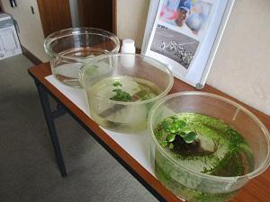 校長室には、卵が入った水槽がどんどん増えています。そして水槽の中では、卵がかえり針子(メダカの稚魚)がどんどん誕生しています。時々スタッフが校長室に来て、針子を見守ってくれています。