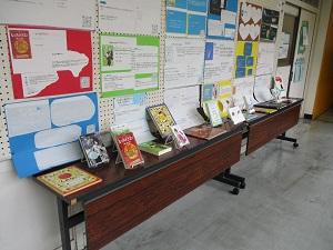 図書館の前に、図書委員のおすすめ本が展示されています。掲示板には、図書委員がおすすめする理由のプレゼンが掲示されています。楽しそうな本がいっぱいあるので、皆さんぜひ読んでみてください。