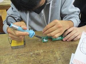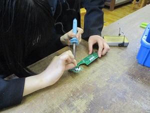 3年生の技術では、ラジオを製作していました。はんだ付けの作業では、はんだが団子状になり苦労している生徒がいましたが、仲良く協力しながら製作を進めていました。