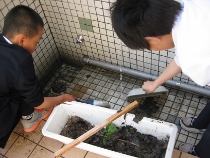 5年生が、運動場出口の手洗い場に落ち葉がたまり、水が流れなくなっていることに気づき、どろどろになった落ち葉を丁寧にどかしてくれました。水が流れた瞬間には、歓声が上がりました。詰まっている様子を、どうにかしょうと根気強く落ち葉を書き出してくれました。とてもありがたいです。
