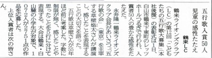 今年もみんなで張り切って応募した「五行歌」作品の入賞者への表彰式がありました。今年の応募総数は2751首もあったそうです。その中から50作品が選ばれました。鳥越小学校からは9作品が入賞です。本日の表彰式へは5名が出席しました。おめでとうございます。(後ろ姿しか撮影でsきませんでした。)