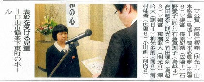 鳥越支所で「ふるさとづくりの集い」がありました。この中で本校の児童3人が作文の朗読を行いました。3人の作文の内容が素晴らしかったのは勿論ですが、発表の姿勢も堂々として、素晴らしいものでした。