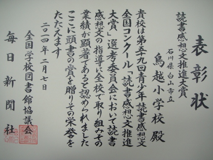 本校が読書感想文指導をはじめ図書館教育に対して学校全体で積極的に取り組んでいることや、学校・行政・地域が一体となって子どもたちの読書活動を推進していることが評価されたものです。そして何よりも家庭での読書活動など、保護者の皆様の協力があってこそ得られた賞だと思います。保護者や地域の皆様には心より感謝申し上げます。