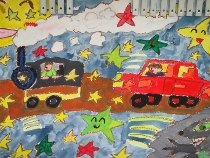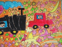 図工の時間に物語の絵を描きました。画用紙が大きくて、色を塗るのが大変でした。ぜも、一生懸命に塗ったので、もうすぐ仕上がります。