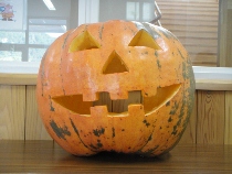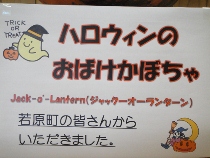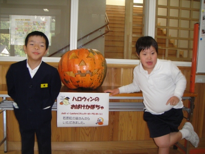 若原地区の方からハロウィン用のお化けカボチャをいただきました。なかよし学級の二人は早速、カボチャの前でポーズをきめました。