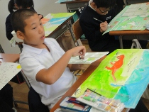5年生は絵の会で物語の絵を描いています。物語を読んで、イメージを膨らませ表現しています。