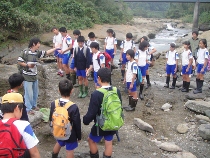 山麓の4小学校の6年生が一堂に会し、ジオパーク学習のモデルコースを巡りました。
