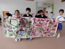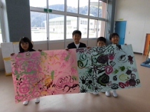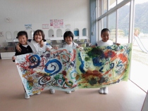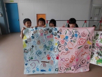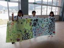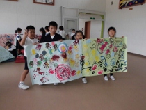 大きな模造紙に好きなように筆を走らせました。中には手を使って描く子もいました。体操服が絵の具だらけの人もいました。