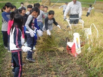鳥越の米作りについて学習をすすめてきた3年生は、今日、渡津町の大田さんにお願いして稲刈り体験をしました。ほとんどの人が初めての体験で、