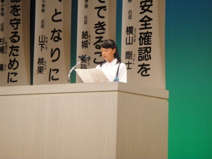 集いの中で、各学校の代表が意見発表を行いました。鳥越小学校の代表のH本さんは、「あの日の出来事」というテーマで意見発表をしました。とても素晴らしい内容でした。